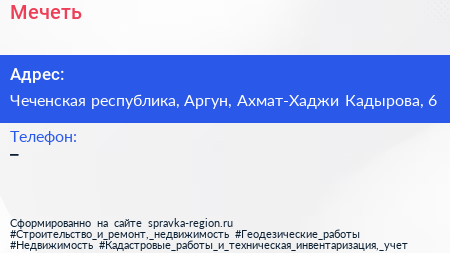 Мечеть по адресу Чеченская республика, Аргун, Ахмат-Хаджи Кадырова, 6 в дальнейшем Организация, размещена в следующих категориях: