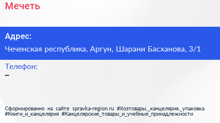 Мечеть по адресу Чеченская республика, Аргун, Шарани Басханова, 3/1 в дальнейшем Организация, размещена в следующих категориях: