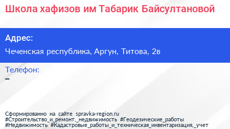 Школа хафизов им. Табарик Байсултановой по адресу Чеченская республика, Аргун, Титова, 2в в дальнейшем Организация, размещена в следующих категориях: