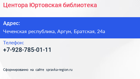 Центора-Юртовская библиотека по адресу Чеченская республика, Аргун, Братская, 24а в дальнейшем Организация, размещена в следующих категориях: