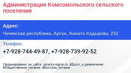 Администрация Комсомольского сельского поселения по адресу Чеченская республика, Аргун, Ахмата Кадырова, 232 в дальнейшем Организация, размещена в следующих категориях: