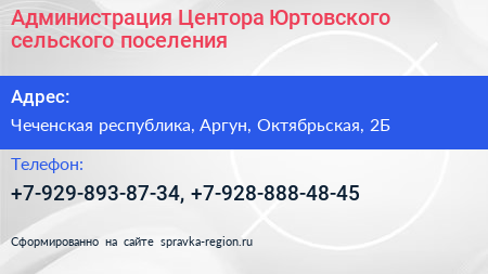 Администрация Центора-Юртовского сельского поселения по адресу Чеченская республика, Аргун, Октябрьская, 2Б в дальнейшем Организация, размещена в следующих категориях: