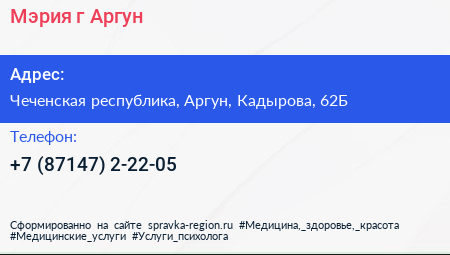 Мэрия г. Аргун по адресу Чеченская республика, Аргун, Кадырова, 62Б в дальнейшем Организация, размещена в следующих категориях: