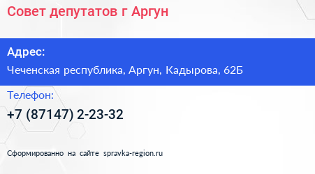 Совет депутатов г. Аргун по адресу Чеченская республика, Аргун, Кадырова, 62Б в дальнейшем Организация, размещена в следующих категориях: