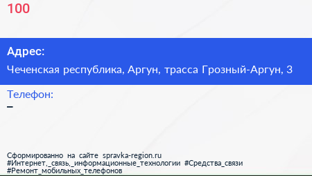 100 по адресу Чеченская республика, Аргун, трасса Грозный-Аргун, 3 в дальнейшем Организация, размещена в следующих категориях: