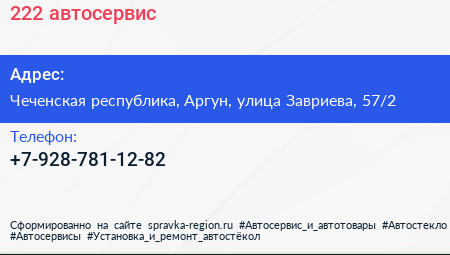 222, автосервис по адресу Чеченская республика, Аргун, улица Завриева, 57/2 в дальнейшем Организация, размещена в следующих категориях: