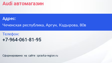 Audi, автомагазин по адресу Чеченская республика, Аргун, Кадырова, 80в в дальнейшем Организация, размещена в следующих категориях: