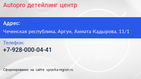 Autopro, детейлинг-центр по адресу Чеченская республика, Аргун, Ахмата Кадырова, 11/1 в дальнейшем Организация, размещена в следующих категориях: