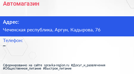 Автомагазин по адресу Чеченская республика, Аргун, Кадырова, 76 в дальнейшем Организация, размещена в следующих категориях: