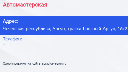 Автомастерская по адресу Чеченская республика, Аргун, трасса Грозный-Аргун, 16/2 в дальнейшем Организация, размещена в следующих категориях: