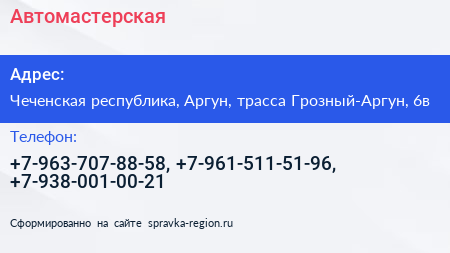 Автомастерская по адресу Чеченская республика, Аргун, трасса Грозный-Аргун, 6в в дальнейшем Организация, размещена в следующих категориях: