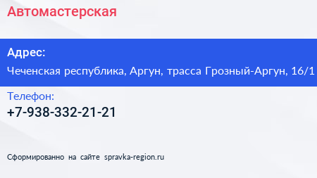 Автомастерская по адресу Чеченская республика, Аргун, трасса Грозный-Аргун, 16/1 в дальнейшем Организация, размещена в следующих категориях: