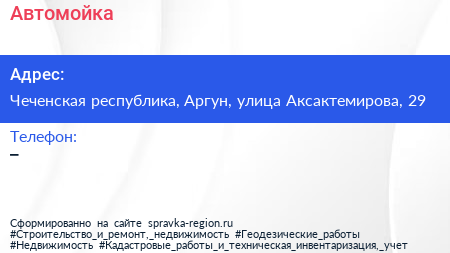Автомойка по адресу Чеченская республика, Аргун, улица Аксактемирова, 29 в дальнейшем Организация, размещена в следующих категориях: