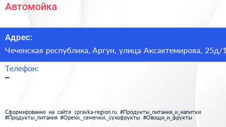 Автомойка по адресу Чеченская республика, Аргун, улица Аксактемирова, 25д/1 в дальнейшем Организация, размещена в следующих категориях: