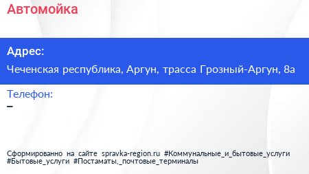 Автомойка по адресу Чеченская республика, Аргун, трасса Грозный-Аргун, 8а в дальнейшем Организация, размещена в следующих категориях: