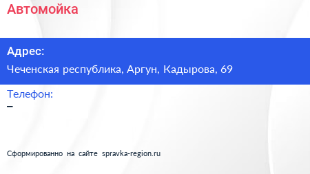 Автомойка по адресу Чеченская республика, Аргун, Кадырова, 69 в дальнейшем Организация, размещена в следующих категориях: