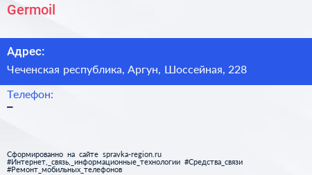 Germoil по адресу Чеченская республика, Аргун, Шоссейная, 228 в дальнейшем Организация, размещена в следующих категориях: