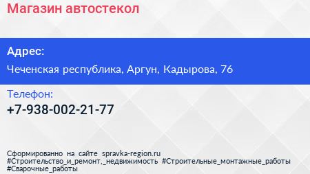 Магазин автостекол по адресу Чеченская республика, Аргун, Кадырова, 76 в дальнейшем Организация, размещена в следующих категориях: