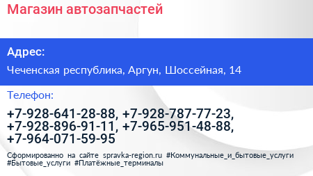 Магазин автозапчастей по адресу Чеченская республика, Аргун, Шоссейная, 14 в дальнейшем Организация, размещена в следующих категориях: