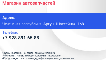 Магазин автозапчастей по адресу Чеченская республика, Аргун, Шоссейная, 168 в дальнейшем Организация, размещена в следующих категориях: