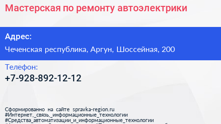 Мастерская по ремонту автоэлектрики по адресу Чеченская республика, Аргун, Шоссейная, 200 в дальнейшем Организация, размещена в следующих категориях: