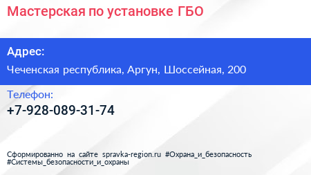 Мастерская по установке ГБО по адресу Чеченская республика, Аргун, Шоссейная, 200 в дальнейшем Организация, размещена в следующих категориях:
