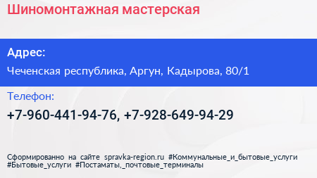 Шиномонтажная мастерская по адресу Чеченская республика, Аргун, Кадырова, 80/1 в дальнейшем Организация, размещена в следующих категориях: