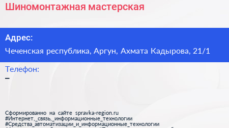 Шиномонтажная мастерская по адресу Чеченская республика, Аргун, Ахмата Кадырова, 21/1 в дальнейшем Организация, размещена в следующих категориях: