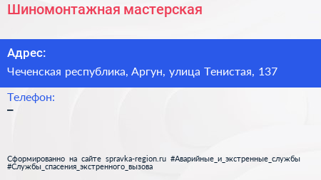 Шиномонтажная мастерская по адресу Чеченская республика, Аргун, улица Тенистая, 137 в дальнейшем Организация, размещена в следующих категориях: