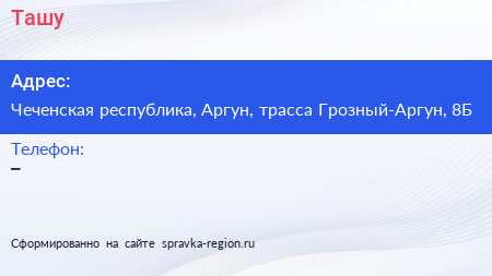 Ташу по адресу Чеченская республика, Аргун, трасса Грозный-Аргун, 8Б в дальнейшем Организация, размещена в следующих категориях:
