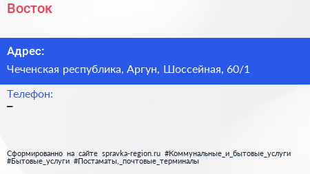 Восток по адресу Чеченская республика, Аргун, Шоссейная, 60/1 в дальнейшем Организация, размещена в следующих категориях:
