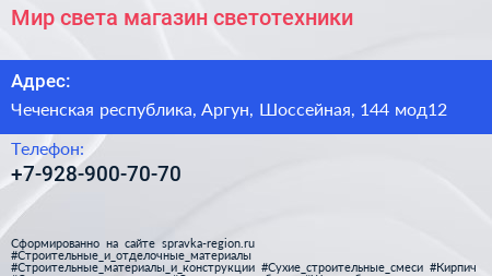 Мир света, магазин светотехники по адресу Чеченская республика, Аргун, Шоссейная, 144 мод12 в дальнейшем Организация, размещена в следующих категориях: