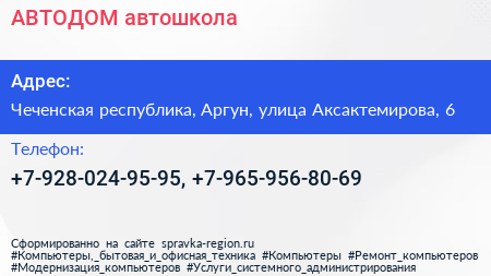АВТОДОМ, автошкола по адресу Чеченская республика, Аргун, улица Аксактемирова, 6 в дальнейшем Организация, размещена в следующих категориях: