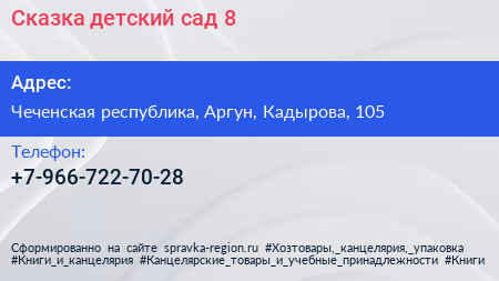 Сказка, детский сад №8 по адресу Чеченская республика, Аргун, Кадырова, 105 в дальнейшем Организация, размещена в следующих категориях: