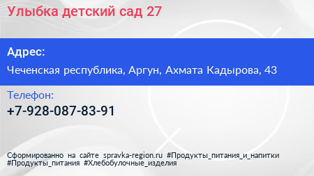 Улыбка, детский сад №27 по адресу Чеченская республика, Аргун, Ахмата Кадырова, 43 в дальнейшем Организация, размещена в следующих категориях: