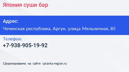Япония, суши-бар по адресу Чеченская республика, Аргун, улица Мельничная, 85 в дальнейшем Организация, размещена в следующих категориях: