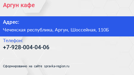 Аргун, кафе по адресу Чеченская республика, Аргун, Шоссейная, 110Б в дальнейшем Организация, размещена в следующих категориях:
