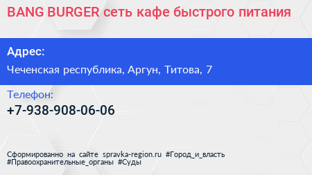 BANG BURGER, сеть кафе быстрого питания по адресу Чеченская республика, Аргун, Титова, 7 в дальнейшем Организация, размещена в следующих категориях: