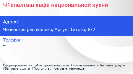 Ч1епалгаш, кафе национальной кухни по адресу Чеченская республика, Аргун, Титова, 8/2 в дальнейшем Организация, размещена в следующих категориях: