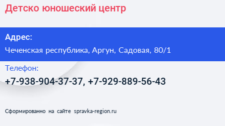 Детско-юношеский центр по адресу Чеченская республика, Аргун, Садовая, 80/1 в дальнейшем Организация, размещена в следующих категориях: