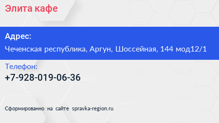 Элита, кафе по адресу Чеченская республика, Аргун, Шоссейная, 144 мод12/1 в дальнейшем Организация, размещена в следующих категориях: