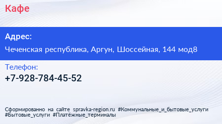 Кафе по адресу Чеченская республика, Аргун, Шоссейная, 144 мод8 в дальнейшем Организация, размещена в следующих категориях: