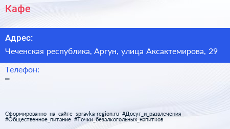 Кафе по адресу Чеченская республика, Аргун, улица Аксактемирова, 29 в дальнейшем Организация, размещена в следующих категориях: