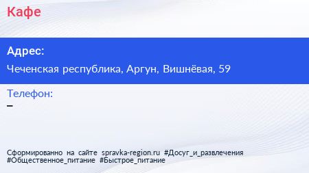 Кафе по адресу Чеченская республика, Аргун, Вишнёвая, 59 в дальнейшем Организация, размещена в следующих категориях: