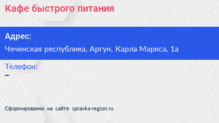 Кафе быстрого питания по адресу Чеченская республика, Аргун, Карла Маркса, 1а в дальнейшем Организация, размещена в следующих категориях: