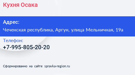 Кухня Осака по адресу Чеченская республика, Аргун, улица Мельничная, 19а в дальнейшем Организация, размещена в следующих категориях: