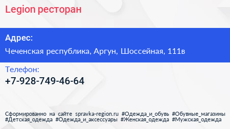 Legion, ресторан по адресу Чеченская республика, Аргун, Шоссейная, 111в в дальнейшем Организация, размещена в следующих категориях: