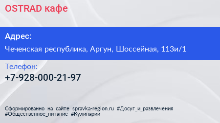 OSTRAD, кафе по адресу Чеченская республика, Аргун, Шоссейная, 113и/1 в дальнейшем Организация, размещена в следующих категориях: