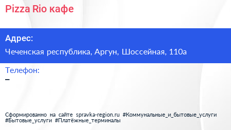 Pizza Rio, кафе по адресу Чеченская республика, Аргун, Шоссейная, 110а в дальнейшем Организация, размещена в следующих категориях: