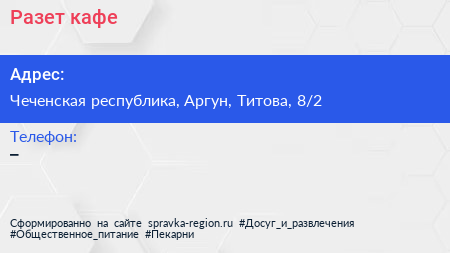 Разет, кафе по адресу Чеченская республика, Аргун, Титова, 8/2 в дальнейшем Организация, размещена в следующих категориях: